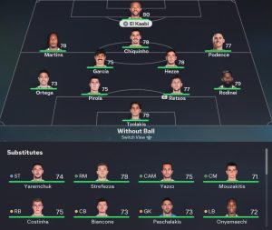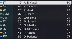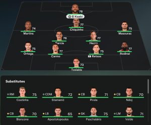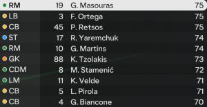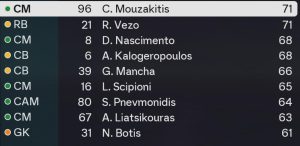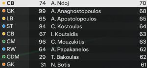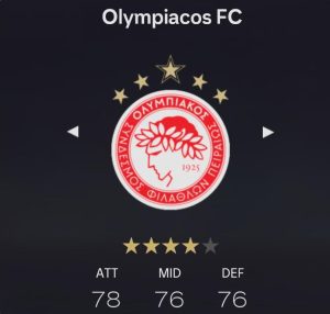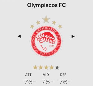 Μετά την περσινή πανεύκολη κατάκτηση του πρωταθλήματος, ο Ολυμπιακός έχει αρκετές προσθαφαιρέσεις στο ρόστερ. Σημαντικές μεταγραφές με παίκτες κοντά στο 80, όπως οι Ταρεμί (78), Στρεφέτσα (78) και Ποντένσε (77). Ακολουθεί ο Καμπελά με 75. Σιπιόνι, Νασιμέντο και Μανσά είναι βαθμολογημένοι με κάτω από 70 και μένει να δούμε αν μπορούν να εξελιχθούν στην πραγματικότητα σε παίκτες ανώτερου επιπέδου.