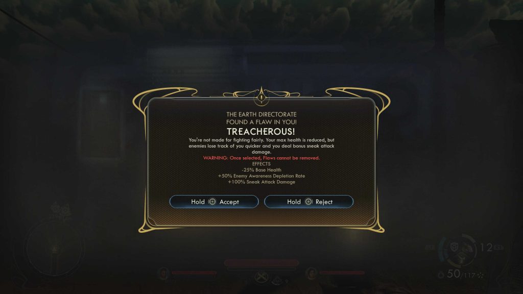 Το μεγάλο highlight του παιχνιδιού όμως είναι τα flaws, καλύτερα stats που έχουν όμως μία παρενέργεια. Πραγματικά γέλασα με τη ψυχή μου με κάποια από αυτά όμως θέλει τεράστια προσοχή το ποια θα κρατήσουμε και ποια όχι. Τα δύο αγαπημένα μου είναι το sungazer και το kleptomaniac. Στο πρώτο αν κοιτάξεις στον ήλιο για αρκετή ώρα, τραυματίζεται ο κερατοειδής σου και για το υπόλοιπο του παιχνιδιού θα τα βλέπεις θολά αλλά θα έχεις health regen τη μέρα και 100% spread damage. Το kleptomaniac flaw, τα πράγματα που κλέβεις τα πουλάς περισσότερο στους vendors όμως υπάρχει η περίπτωση να κλέψεις τυχαία αντικείμενο και να μπεις σε μπελάδες.
